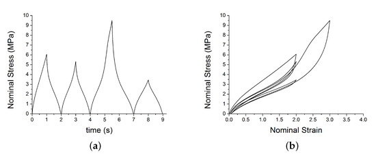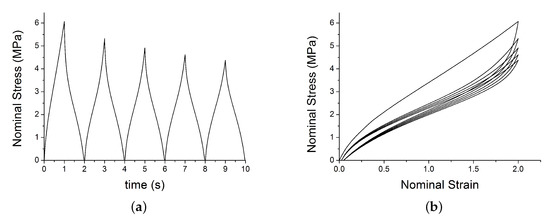 Most of these models include softening effects using non-time dependent mathematics, e.g., by softening the material based on maximum strain or stress measures. In contrast, experiments clearly show that softening proceeds by repeatedly stretching the material to a predefined load (cyclic stress softening) or by holding it at constant stretch (stress relaxation) [24]. More specifically, stress decreases logarithmically [25,26,27]. In a recent review article [14] it was found that no predictive model was able to fully reproduce cyclic stress softening to a satisfying quality. In the next sections a new approach based on a recently proposed model [28] is presented. It is able to account for non-linear elasticity and strain history effects.