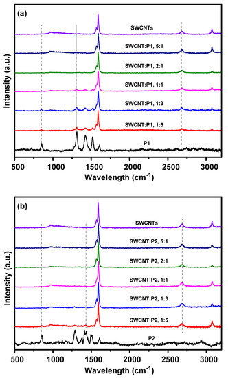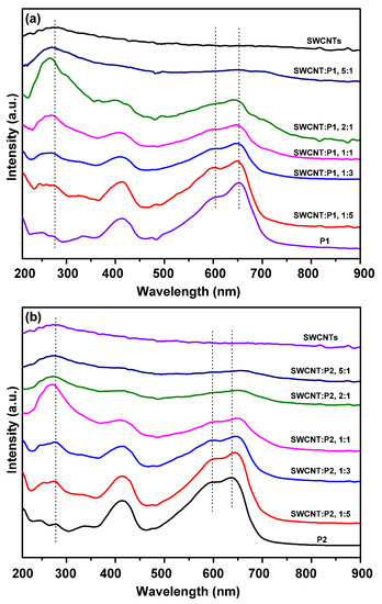 The UV-Vis absorption spectra were recorded to study the electronic band structures and interfacial interactions of P1/SWCNTs and P2/SWCNTs composites. The peak at around 270 nm should be assigned to SWCNTs, and its intensity was enhanced upon increasing the amounts of the SWCNTs (Figure 2a,b), accompanied by a shifting of the spectra by a few nanometers. The peaks at around 600 nm and 650 nm for P1/SWCNT composites shifted to small wavelengths as the amounts of SWCNTs increased, however, we noticed a small red shift of the peaks at around 600 nm and 650 nm to longer wavelengths for P2/SWCNTs, indicating that different packing styles existed in the P1/SWCNT and P2/SWCNT composites, and we speculate that the different packing features should be caused by the more intensified interfacial interactions of P1/SWCNTs than that of P2/SWCNTs, although the detailed packing features of the composites are still unclear at the current stage.