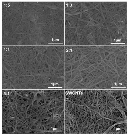 Scanning electron microscope (SEM) images of P1/SWCNTs composite films with different amounts of SWCNTs.