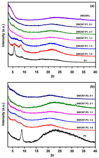 Grazing incidence X-ray diffraction (GI-XRD) spectra of the (a) pristine P1 and its SWCNT composites and (b) pristine P2 and its SWCNT composites.