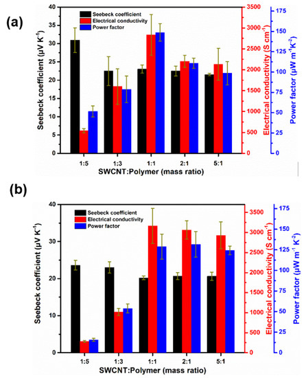 Electrical conductivities, Seebeck coefficients, and power factor values of P1/SWCNT (a) and P2/SWCNT composite films (b).