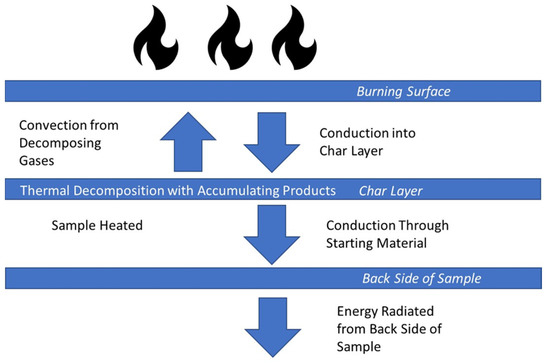 Fiber with increased fire resistance can be crafted by blending novel material resources. Wool fiber waste and cellulose acetate were combined to create a keratin-cellulose filament with superb fire resistance. The structure of the fiber, and the diameter, length, aspect ratio, and angle between axes are also critical [37,54]. The orientation of the fiber (as related above by alpaca wool), the polymerization degree, and the crystallinity play important roles. Higher cellulose crystals give rise to more levoglucosan during decomposition, but afford higher ignition temperature due to the latent heat of activation necessary to melt the crystalline domains [37]. This is exemplary in amorphous cellulose requiring 120 kJ/mol compared to crystalline cellulose (from cotton and ramie fibers) needing 200 kJ/mol. Fibers that are longer, larger (by diameter), structured (woven, matted, etc.), and aligned in the direction of loading all have improved mechanical strength. Both the polymerization degree and orientation either facilitate or inhibit the oxygen diffusion during decomposition. When comparing cotton and ramie, ramie’s high orientation affords a higher thermal stability limit. The effect of these two components can be demonstrated best by the extrapolated interaction of their structures in blended composites. An effect observed both in mixed-fiber composites and due to weight percent addition, in matrix systems, is the reinforcement of molten matrix products’ proximal to and contacting the heat source—this is termed “scaffolding effect” [37].