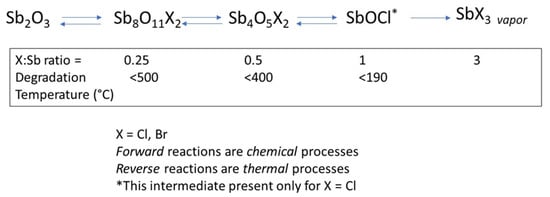 Whether additive or reactive [8], flame retardants were developed with five characteristic effects designed to impart flame retardancy: heat adsorption via endothermic decomposition releasing inert products; enhanced heat or mass flux to protect virgin material; free radical scavenging products to quench the thermodynamic or chemical combustion; decreasing the heat flux or mass transfer across the burning surface via protective layer formation; and modification of the chemical pathway of polymer degradation—see Figure 1 [7,8]. The “Fire Triangle” demonstrates the interdependent components of a self-sustaining flame; any of these components are targets of the preceding characteristics. To evaluate these five FR characteristics, the influencing factors that impact the self-sustaining flame must also be defined: O2 content, net heat flux, effective pressure, and char residue formation mechanisms [7]. Inorganic fillers (metal hydroxides, metal oxides, hydroxy-carbonates, borates, silicon, silicates, (nano-) clays, graphene, etc.), HFRs (both additive and reactive), organic additives (particularly containing elemental or conjugated P and-or N), and intumescent systems have been evaluated for a variety of polymers [8,22]. Exemplary in the development of fundamental knowledge, the chemical and thermodynamic mechanisms of halogenated compounds coupled with metal hydroxides and select additives polymer interactions have been well elaborated [7,8]. Figure 2 shows an example system’s mechanism wherein Sb, Cl, and/or Br synergistically improves fire retardancy.