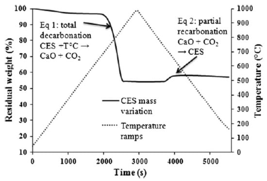 Chicken eggshell (CES) is an incredible bio-waste from aviculture at 150,000 tons per year (USA) whose disposal constitutes an environmental hazard where production is large [26]. Its composition, among three areas—the shell (cuticle), inner (lamellar), and outer (spongy) membranes—is 95% inorganic calcium carbonate with a mix of collagen type X, sulfated polysaccharides, and proteins composing the sum [5,26]. Indeed, just 2.5–5 wt % of silica fume (SF) (an industrial inorganic waste product) lends increased adhesion to (acrylic) intumescents for steel with improved flame spread and oxidation resistance, and an increase thermal stability in the range of 700 °C due to non-combustible gaseous release which promotes the intumescent system as a spumific [5,26]. The thermal degradation of CES was found to be a bi-stage mechanism; the first from 300 to 790 °C is the 7 wt % dehydration, and the latter between 790 to 907 °C is the oxidation of the calcium carbonate and the release of CO2, resulting in a total 53 wt % residue [26]. There is an interesting-weight gain phenomenon for CES depicted in Figure 3 and Figure 4 ascribed to a re-carbonization. An APP/melamine/PER/SF/CES (37:18.5:18.5:7.4:18.5) intumescent system (with 40 wt % residue at 750 °C) was tested on structural steel samples [26]. This coating exhibited exceptionally dense, non-cracking multicellular (expanded foam) char expansion, compared to non-CES systems, and good adhesion contributing to a thermal protection gradient difference compared to bare steel of 450 °C—exceeding qualifying peak temperature tolerance per Eurocode by ≈66% [26].