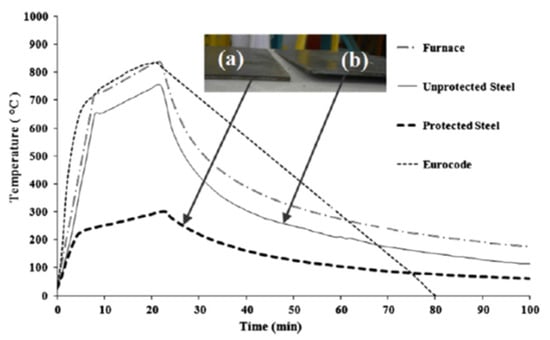 Time temperature curves for Eurocode, (a) protected and (b) unprotected steel plates [26].