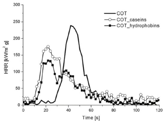 CC HRR curves for cotton, casein, and hydrophobin-treated cotton [36].