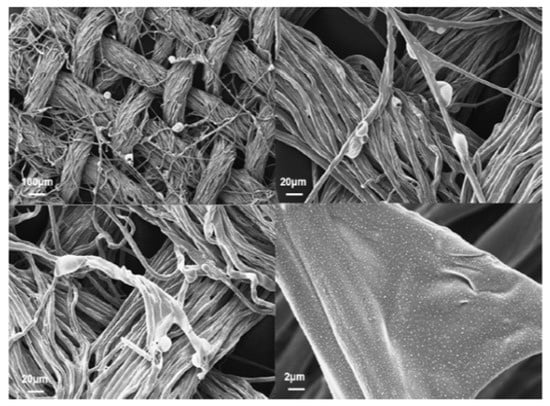 Hydrophobins emerge from filamentous fungi rich in cysteine containing proteins (circa 7–9 kDa molecular mass)—comparable to the content found in keratins of wool [10,36]. These are qualified, despite their characteristic octo-cystiene bridge scaffold structure, by differences in hydrophobic and hydrophilic amino-acid residue distributions, into two classes: I which are insoluble in aqueous media and have low wettability, with SC3 and EAS as leaders; and II, which aggregate but are water soluble, with HFBI and HFBII as eminent members [10,11,36]. Beginning its degradation circa 200–270 °C, releasing phosphoric and sulfidic acid (and gaseous H2S) as disulfide bonds break, it promotes a stable char around 570 °C. Furthermore, a sample dipped in mixed hydrophobins extended the degradation of cellulose (with a 20 wt % coating) beyond the pure cotton into a (an unprecedented) third stage circa 620 °C [36]. Table 3 shows the BR reduction and residue increase, while Figure 9 vividly demonstrates this action through spherical domains which protect the underlying fabric [36]. The ignition of the treated fabrics is sensitized; however, the BR is reduced and the PHRR is 45% decreased compared to pure cotton [9,36].