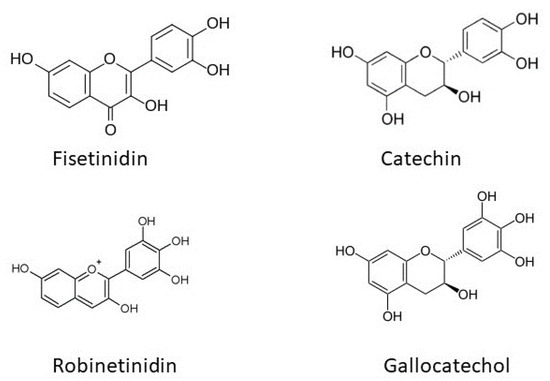 - Benyahya, S.; Aouf, C.; Caillol, S.; Boutevin, B.; Pascault, J.; Fulcrand, H. Functionalized green tea tannins as phenolic prepolymers for bio-based epoxy resins. Ind. Crop. Prod. 2014, 53, 296–307. [Google Scholar] [CrossRef]