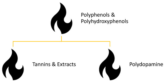 Polydopamine is another phenolic-rich material, derived from three chemical steps from naturally occurring dopamine. This polyphenol has the advantage of bringing nitrogen groups to the combustion zone, and has been shown to be an effective FR coating material which can be used, for example, on polyurethane foams. The polydopamine is not highly flammable, which differs from tannic acid, but this coating nonetheless is a good source of thermally-stable char [87].