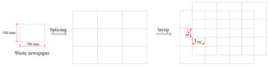 Recently, unshrouded recycled paper sheets were used to fabricate laminated composites based on their advantages of high consistency in quality, source, and mechanical properties. The influence of paper type, matrix selection, and fiber loading on the physical and mechanical properties of the composites have been studied [7,8,9,10]. High utilization ratios of waste paper and desired mechanical performances were achieved. It has been proven that it is an efficient way to utilize the recycled paper sheet as a laminar for enhanced laminated composites. However, so far the paper sheet based laminated composites manufactured in the laboratory were still small in size, which would limit its application in the aerospace and other engineering fields, where a large-scaleale is required [11,12,13,14]. In practice, for a large scale paper sheet laminated composite structure, all the paper sheet layers need laminar splices with the junction of different paper sheets in order to extend the dimensions of length and width. When a splicing structure occurs, it inevitably introduces defects at the splicing areas, which may pose serious stress concentration.