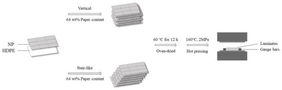 Laminates were fabricated by stacking NP sheets and HDPE films alternately with the same direction, where paper content was 64 wt %. Then, laminates were hot-pressed for 25 min to ensure a sufficient compaction and infiltration. The heating temperature and pressure were set to 160 °C and 2 MPa, respectively. Besides, to investigate the effect of thickness on the physical and mechanical properties of the composite, laminates with cross direction 0°/90° and different thickness were also prepared. Steel bar frames with different thickness were used as a thickness gauge for precisely controlling the thickness of the composites to be a certain value. Specimens for property testing were cut from the composites along cross-laminated directions using a mold cutter and each sample had a splicing line at the center.