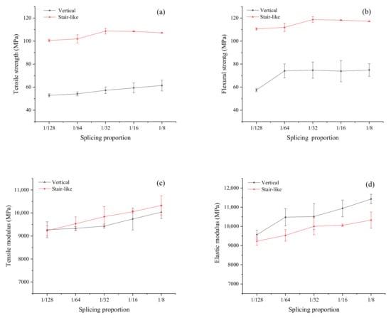 Effects of splicing proportion on tensile strength (a), flexural strength (b), tensile modulus (c) and elastic modulus (d) of composites with 0° direction.