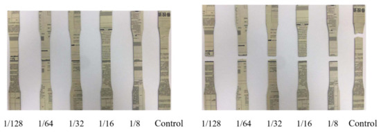 The effects of different splicing positions at the paper sheet length and width directions on the tensile and flexural strength of the composites are shown in Figure 4. It could be observed that both the tensile and flexural strength of the samples with a vertical splicing junction were lower than those of samples with a stair-like splicing junction. The junction uniformly distributed along thickness for the stair-like splicing pattern meanwhile the junction repeated at the same vertical position along thickness for the vertical splicing pattern. The junction between the laminar was a defect to break the continuity of reinforcement, which would cause stress concentration and deficient stress transfer. It was reported that the stress at the splicing positions were transferred by the matrix and the mechanical strength of the composites were increased with the increasing splicing distance [18]. The paper sheet acted as a reinforcement and the HDPE film was like a binder. The splicing distance between the two adjacent junctions determined the overlap area to affect the weakening effect on the mechanical properties of the composite. Generally, the mechanical strength of the composites will increase with increasing the splicing length, and there will be a critical length where the strength increase is no longer significant [19]. Both the tensile and flexural strength increased with the increase of the splicing distance. However, the increase became flat when the splicing distance reached the proportion of 1/32, where the overlap lengths at the length and width directions were 24 and 16 mm, respectively. The fractures were mainly located at the center of the specimens, where there was one of the splicing positions (Figure 5). To minimize the weakening effects of the junction on the mechanical properties of the composite, the overlap size should be greater than the critical proportion of 1/32 during the stacking procedure for a large-scaleale composite. When the splicing distance was the ratio of 1/32, the tensile and flexural strength of the composites were 109 ± 2.6 and 119 ± 2.6 MPa, respectively, which were very close to those of the control samples without splicing. The elastic moduli of stair-like splicing composites were lower than those of vertical splicing composites, which were thought to be due to the damage mode of different splicing patterns. For stair-like splicing composites, samples in flexural testing were progressively damaged with a large deformation. Brittle fracture occurred since there was a stress concentration at the vertical splicing position of the vertical splicing sample. Therefore, the elastic moduli of the composites with a stair-like splicing pattern were much lower.