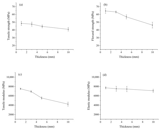 Effects of thickness on tensile strength (a), flexural strength (b), tensile modulus (c) and elastic modulus (d) of composites with vertical splicing.