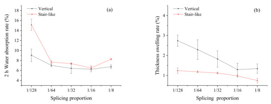 The 2 h water absorption (a) and thickness swelling rate (b) of composites with different splicing proportions.