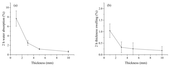The effects of thickness on the water up-taking behavior are shown in Figure 8. Similarly, all samples showed unexpected high values of water absorption and thickness swelling rate. Since the NP layers stacked alternately with the HDPE films, it can be considered that the moisture was mainly transferred along the transverse direction rather than the thickness direction. The HDPE layers between the NP layers performed as a barrier to water transfer, and the cross sections of the samples were not protected from water uptake, leading to accelerated water absorption. The 2 h water absorption and thickness swelling of the composites decreased with the increase of the laminated thickness. The 2 h water absorption and thickness swelling of composite samples were 0.67% ± 0.17 % and 0.18% ± 0.18 % when the laminated thickness increased from 1 to 10 mm. It was thought that the excessive permeation of the HDPE would destroy the continuity of paper fibers to reduce the reinforcement of the paper sheet on the mechanical properties of the composites. However, the excessive permeation of the HDPE would form a hydrophobic coating to reduce water up-taking sites of the composites.