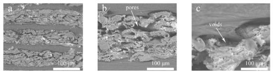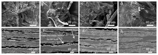 The composite microstructures with 1/32 splicing proportion and 5 mm thickness are shown in Figure 9. The NP layer has lots of pores, voids and transverse cracks. The interface between NP and HDPE were clearly observed due to a weak bonding interface because no coupling agents and any surface treatment of the NP were used. The voids can also be seen between the NP and HDPE layers. It was found that the interfacial bond between NP sheet and HDPE layers was the mechanical interlocking rather than the chemical binding, where the HDPE acted as an adhesive so that fibers were bonded tightly to form a dense structure (Figure 10d). The mechanical interlocking performs desirable bonding capability where the transverse cracks and delamination mainly occur inside the NP layer rather than the bonding interface (Figure 10e–g).