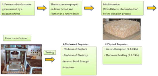 Feathers were procured from a commercial chicken farm located in Tehran, Iran. The preliminary evaluation of the costs revealed that separation of feather fibers from the quills would be costly and not encouraging for composite-manufacturing factories. It was decided that the whole feather would be used in this study so that any possible positive results could be directly used on a commercial scale. Therefore, only the feathers of the body, which are small and flexible enough for MDF production, were mixed with the wood fibers and chips in a drum-mixer to form the wood–chicken feather composite-mat. The length of the feathers ranged from one to three centimeters. The flow diagram of this experimental procedure is presented in Figure 1.
