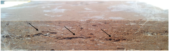 The highest modulus of rupture was observed in wollastonite-treated MDF panels without feathers (15.5 MPa) (Figure S4, from the Supplementary Materials). Wollastonite improved modulus of rupture in all panels. This improvement was attributed to reinforcement of resin [15,46], as well as formation of new bonds between wollastonite and wood polymers [25,26]. The addition of feathers to the MDF panels significantly decreased modulus of rupture. In this connection, the level of decrease in 5%-feather content was small in comparison to the high significant decrease that occurred in the 10%-feather content panels. In fact, visible checks and cracks (internal blows) occurred in the core section of the mat in 10%-feather MDF panels (Figure 3). This clearly showed that this amount of feather content would not be suitable for MDP panels made with UF resin, as the UF resin is not compatible with keratin in chicken feathers. These cracks were reported to be the main reason for the higher mass loss values in specimens exposed to fungi attack [24]. It was concluded that 10%-feather content was too high, but 5%-feather could be considered suitable to satisfy the fiber shortage and keep the physical and MOR properties at satisfactory level. The addition of wollastonite decreased MOR in particleboards (Figure S4, from the Supplementary Materials). Only panels with 10% feather content showed an improvement by addition of wollastonite, maybe due to the higher hygroscopicity of chicken feather.