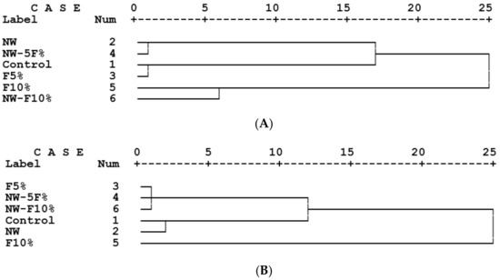 The cluster analysis of the MDF panels based on all physicomechanical properties studied (water absorption and thickness swelling after 2 and 24 h immersion in water, modulus of rupture, modulus of elasticity, brittleness, internal bond and hardness at 5.4 mm of penetration) showed a different clustering of control and wollastonite-treated panels. The cluster analysis identified the significant effects of wollastonite on the overall physical and mechanical properties of medium-density fiberboards (Figure 4A). Wollastonite–5%-feather treatment was closely clustered to wollastonite-treated panels; this clearly showed that, although there was an addition of feathers to the MDF-matrix, and a significant diminishment in properties was anticipated, wollastonite could compensate for the loss to a great extent. With due consideration to the mitigating effects of wollastonite on the overall properties, future studies on decreasing resin content are to be carried out, similar to what was previously achieved by the application of tannin in wood-composite panels [27,28,29,30,31,32]. Moreover, 5%-feather treatment was closely clustered to the control panels; this indicated that through addition of 5% of feathers to the MDF-matrix, the overall properties remained the same. Therefore, it can be concluded that chicken feathers can be used in MDF manufacturing programs. However, the addition of 10% of feathers to the MDF-matrix resulted in a significant difference in the overall panel properties; 10%-feather panels were remotely clustered to the rest of the treatments.