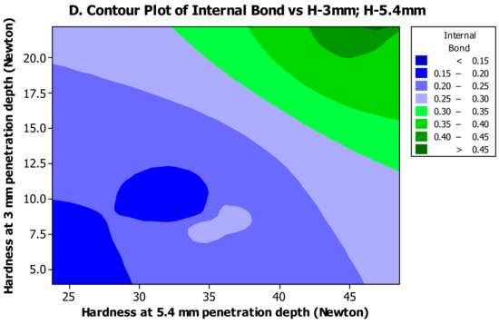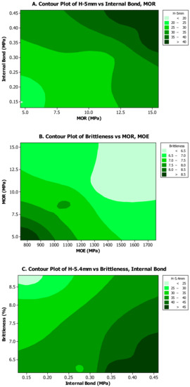 Contour plots showed an increasing relationship of hardness values versus internal bond and MOR values (Figure 5A). However, brittleness showed a completely inverse relationship with the mechanical properties of MOR and MOE (Figure 5B). Moreover, it was found that hardness had a straight relationship with internal bond values, but an inverse relationship with brittleness (Figure 5C). The contour plot of internal bond versus hardness at two depths (3 and 5.4 mm) demonstrated a direct relationship with both shallow and deeper penetrations of the hardness ball (Figure 5D); this implied that addition of wollastonite and feathers to mat had similar effects on different layers of composite panels.