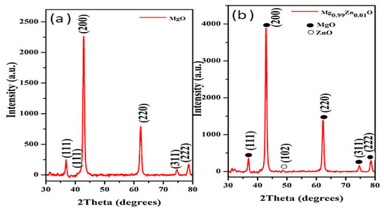 The MgO nanoparticle has stability and is suitable for human health as they are necessary minerals. On the other hand, the ZnO nanoparticle has superior antibacterial and antimicrobial properties [26,27,28,29]. The potential use of ZnO nanoparticles in biomedical applications is gaining interest in the scientific and medical communities due to their physical and chemical properties [30]. In this work, using Zn-doped MgO nanoparticles instead of simple ZnO or MgO nanoparticles was preferred. In Figure 2, the sharp and intense peaks indicated that the samples were highly crystalline as compared to simple ZnO or MgO nanoparticles.