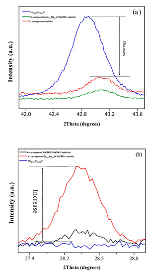 Figure 4a,b show the diffraction peaks related to MgO-nanoparticles and Catechin κ-carrageenan/NaCMC, κ-carrageenan/NaCMC/Mg0.99Zn0.01O/Catechin. As expected, the intensity of the diffraction peak increased as the ZnO amount increased in the compound (Figure 4b). The estimated crystalline sizes for Mg0.99Zn0.01O and κ-carrageenan/NaCMC/Mg0.99Zn0.01O/Catechin were 18 and 20 nm, respectively.