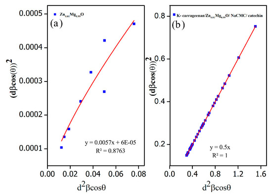Some methods can be used for calculating the crystalline size such as Scherrer and size-strain plot (SSP). In the Scherrer method, the considered sizes are 18 and 20 nm for κ -carrageenan/NaCMC/Mg0.99Zn0.01O/Catechin and Mg0.99Zn0.01 O, respectively. SSP methods are more common and powerful methods than the Scherrer method since the strain of the lattice affecting the intensity and position of the diffraction peaks is considered for the calculations. The obtained XRD data were analyzed by the SSP method. In this method, is plotted regarding as the following relation.