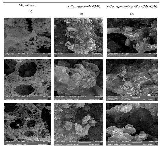 FESEM images of (a) Mg0.99Zn0.01O, (b) κ-carrageenan/NaCMC, and (c) κ-carrageenan/Mg0.99Zn0.01O/NaCMC.