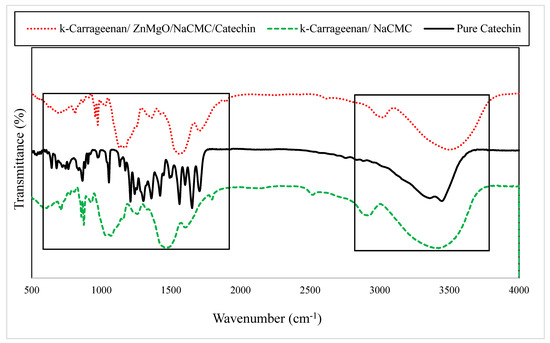 FTIR spectra of κ-Carrageenan/ Mg0.99Zn0.01O /NaCMC/Catechin, κ-Carrageenan/NaCMC, and pure (+)-catechin.