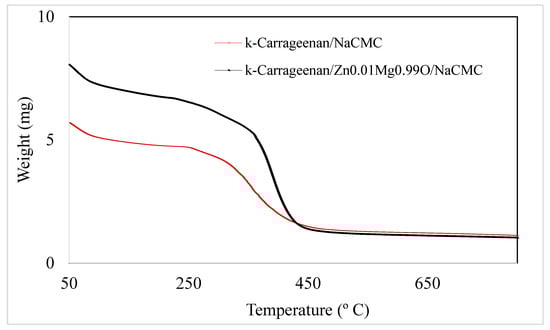 The TGA curves of the two carrageenan complexes are presented in Figure 8. The curves showed that approximately 80%–90% of the weight of the hydrogels was lost at 90° C. The second loss in the weight of the hydrogel was in the range of 250–390 °C for κ-Carrageenan /NaCMC and 250–420 °C for κ-Carrageenan/Mg0.99Zn0.01O/NaCMC. The first network degradation is related to the dehydration of the complex [46,47]. The entrapped water inside the matrix evaporates at this temperature. This water exists in an H-bonded form with the hydroxyl groups of glycosylic units along the polymer chain [37]. The increase in the decomposition temperature in κ-Carrageenan/Mg0.99Zn0.01O/NaCMC was related to the dispersion of the nanoparticle in the matrix. The second complex degradation was attributed to destroying the dense crosslinking of polymer chains inside the three-dimensional network [48]. The additional endothermic peak near 420 °C was characterized by the decomposition of Mg (OH)2 as an amorphous gradient to form MgO in the form of crystalline. The weight loss of the κ-Carrageenan/Mg0.99Zn0.01O/NaCMC sample was almost 17% [48].