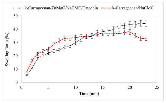 Immersion of hydrogel in distilled water is aimed to increase the swelling in order to be loaded with different small-scale composites within its network such as drugs. The ion loading in nanocomposites depends on the swelling ability of hydrogels. Therefore, sodium salt of carboxymethylcellulose (CMC) was chosen to be mixed with κ-carrageenan to increase its swelling ability in distilled water. It is well known that NaCMC is the best-applied cellulose derivative [49]. It is made by treating cellulose with CH2ClCOOH, chloroacetic acid, and sodium hydroxide, which is in accordance with the Williamson etherification reaction. Among all cellulose derivatives, only the sodium salt (NaCMC), is a polyelectrolyte, which presents both ionic-strength and pH sensitivity variations. Furthermore, NaCMC has acceptable swelling capability [50,51]. The swelling rate of hydrogels is shown in Figure 9. Clearly, κ-Carrageenan/Mg0.99Zn0.01O/NaCMC/Catechin had the largest swelling ratio (44.15%) rather than the κ-Carrageenan/NaCMC (33.22%). The improvement in the swelling capacity of modified hydrogels can be due to more hydrophilic chains or hydration of functional groups on the polymeric chains [41,42]. During the experiment, it was clear that the hydrogels including Mg0.99Zn0.01O were physically harder gels (more stable) than the other hydrogels.