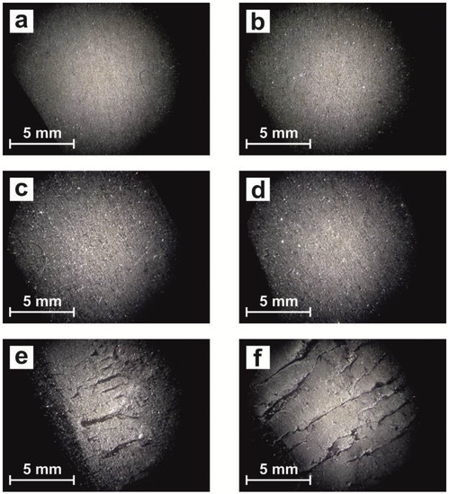 For this reason, the exposure surface also was observed by stereoscopic loupe (Figure 2), where the effects of exposure clearly show an increase in the number and size of surface cracks when the exposure time increases. When SEBS was not exposed to light, the surface was completely smooth (Figure 2a) and, with low levels of exposure, the surface had a similar aspect (Figure 2b–d), but with high exposure to light (Figure 2e–f), the surface clearly changed and a lot of cracks appeared, which indicated the degradation process.