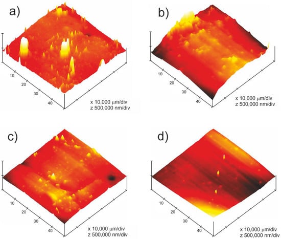 Atomic force microscopy (AFM) was used to determine the surface topography and roughness of the aged samples [20,47,48]. AFM analysis was performed on a Multimode AFM microscope with a Nanoscope IIIa ADCS controller (Veeco Metrology Group, Cambridge, UK). A monolithic silicon cantilever (NanoWorld Pointprobe® NCH, Neuchâtel, Switzerland) with a force constant of 42 N/m and a resonance frequency of 320 kHz was used to work out the tapping mode. By taking the analysis of the images, the root-mean-squared roughness (Rrms) and the maximum height for the topographic profiles measured on 50 µm × 50 µm images were evaluated.