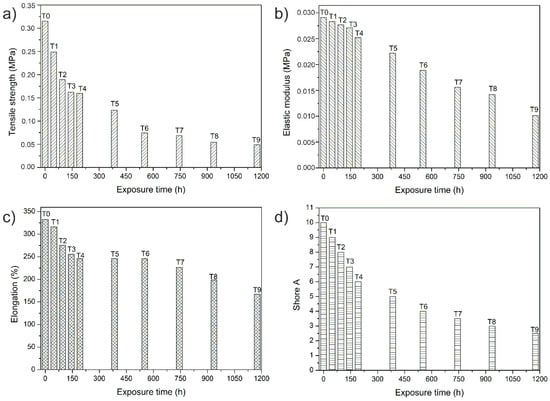 Elongation at break (Figure 5c) also decreases with increased exposure to UV radiation, although, once again, this decrease is not as pronounced as for the tensile strength. The effects of UV exposure appear to occur from T4, and increase up to T9, producing a total decrease in elongation of 50% in relation to T0. This behavior is not as pronounced owing to the elastomeric characteristics conferred on the materials by its chemical structure.