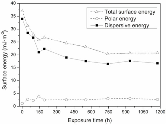 Total surface energy is seen to decrease as exposure time increases, Figure 7. Given the increase in contact angle (Figure 6), this indicates a change in the surface of the material and a reduced wettability [63,64]. All of this is related to the roughness of the surface, which is thought to decrease with exposure time as the surface energy decreases. The loss of surface energy in relation to the unexposed test piece (T0) is 54%.