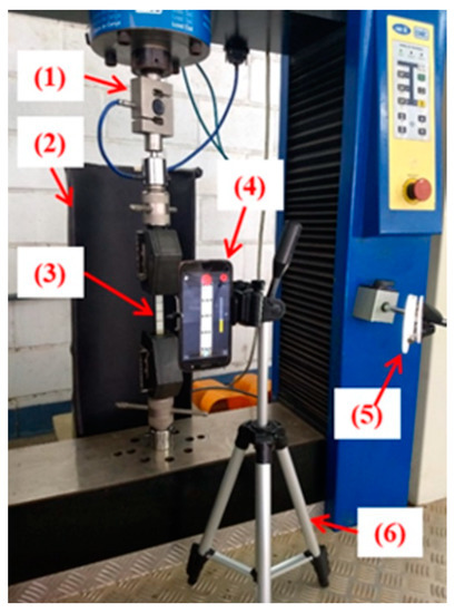 Tensile test set-up. (1) Load cell of 20 kN; (2) black cardboard to make a contrast in the background of the specimens; (3) tensile specimen; (4) digital camera of 13 MegaPixel; (5) lighting and (6) pedestal.