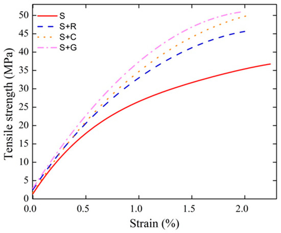 Representative true tensile stress–strain curves are shown in Figure 3. From these curves the tensile data was calculated (i.e., tensile strength, the Young’s modulus and tensile failure strain).