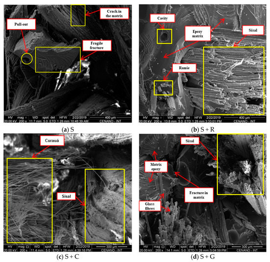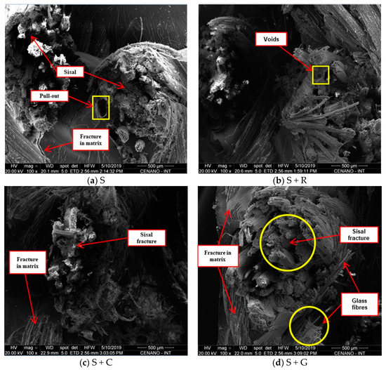 The flexural strength of S+R composites increased by approximately 37.81% compared to non-hybrid sisal composites, while S+C and S+G presented an increase by approximately 51.63% and 58.54%, respectively. As expected, the S+G composite presented the best flexural strength (82.6 ± 4.77 MPa), which is explained by the better adhesion of synthetic fiber to epoxy matrices [41]. Cavalcanti et al. [17] also found that the jute + glass fiber composite presented the best flexural strength (166.92 ± 35.33 MPa), compared to jute + sisal and jute +curauá composites.