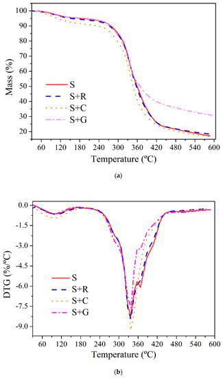 Thermogravimetric analysis (TGA) measurements were performed to obtain information on the thermal stability of the composites. Figure 6 shows the composite thermal degradation as a function of hybridization. It is well known that when the material is degraded, it loses mass in the form of volatiles [31]. From Figure 6a it can be seen that the TG curves showed similar tendencies. It should be noted that the S+G composites show low mass loss at higher temperatures when compared to natural hybrid composites. This was expected, since the decomposition temperature of glass fibers is higher compared to the decomposition temperature of the natural fibers.