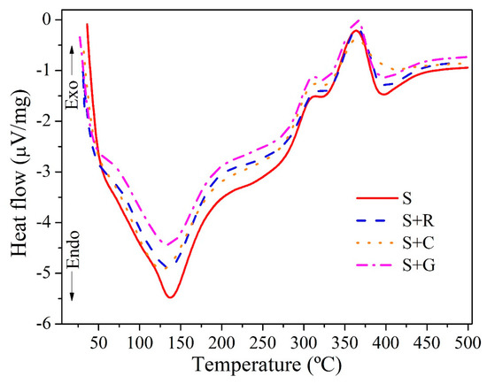 Figure 7 presents the DSC curves for the hybrid composites studied, where two events predominated (endothermic and exothermic). The endothermic peak appeared from room temperature to 140 °C and is related to the dehydration process of the composite samples [30,45]. The S+R and S+C composites presented a slightly lower endothermic peak value compared to non-hybrid S composites (approximately 136.5 and 137.8 compared to 140.5 °C). This can be explained by the fact that composites with higher natural fiber content shows a higher water absorption [5]. Furthermore, the exothermic peak found around 365 °C is attributed to the decomposition of cellulose/lignin and the matrix [47,48,49].