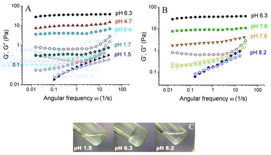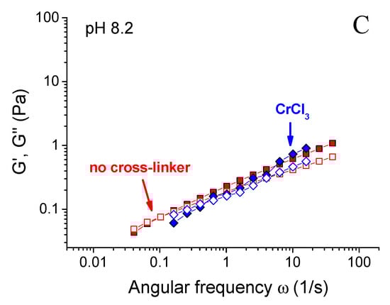 First, the effect of preparation pH on the rheological properties of xanthan/CrCl3 aqueous solutions was studied. It is seen from Figure 2 that they show gel-like behavior in a rather wide range of pH from 1.7 to 7.8: the storage modulus G’ was higher than the loss modulus G’’ in the whole range of frequencies studied, and G’ was nearly independent of frequency and shows a rubbery plateau. This was evidence for the formation of cross-linked xanthan network in the whole volume of the sample. However, at very low (1.5) or at very high pH (8.2) the samples lose elastic properties, which was evidenced by the disappearance of the plateau at G’(ω) dependence, and by the presence of cross-over point of G’(ω) and G’’(ω). Such a change in the rheological behavior manifested in the visual appearance of the samples, which behaved like gels and did not flow at intermediate pH, but are liquid-like at low or high pH (Figure 2C).