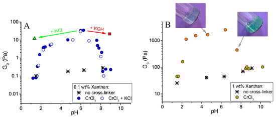 The effect of pH on the properties of xanthan gels was similar in semidilute unentangled regime (at 0.1 wt % xanthan, Figure 3A) and in semidilute entangled regime (at 1 wt % xanthan, Figure 3B): the critical pH values (2.4 and 6.3) were equal for both xanthan concentrations. Though 1 wt % xanthan solutions behave as highly viscoelastic solutions even in the absence of the cross-linker [44], their elasticity is greatly enhanced by the addition of Cr3+ cross-linker in the pH range 2.4–6.3. The elastic modulus at pH 6.3 exceeds 2.5 kPa. For 1 wt % xanthan, the formation of insoluble chromium (III) hydroxide at high pH is confirmed by the visual appearance of the gels: they are bluish at pH < 6 due to the presence of unreacted excess Cr3+ ions, but become green at pH > 6 due to the presence of Cr(OH)3.