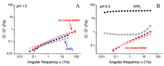 When pH was decreased below 6.3, the drop of the storage modulus was seen. First, only a slight 10-fold decrease of the storage modulus of the gels was observed (Figure 3A), but it stayed much higher than for the solutions in the absence of CrCl3. It means that the cross-linked xanthan network persisted in this range. Below a critical pH value of ~ 2.4, a drastic drop of G0 occurred, accompanied by a transition from a gel into a liquid (Figure 2). At pH 1.5, the rheological properties of the solutions with and without added CrCl3 were very close (Figure 4A), meaning that below pH 2.4 a cross-linked xanthan network was gradually disrupted, and at pH 1.5 xanthan macromolecules were no longer cross-linked.