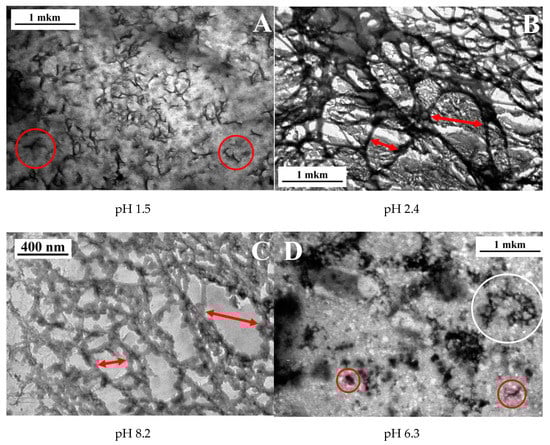 Finally, at pH 8.2, no network throughout the whole volume is seen (Figure 5D), which is in accordance with the low elasticity and liquid-like behavior of the samples due to the transformation of Cr3+ into Cr(OH)3. Instead, some individual “globular” objects (marked by red circles), and network “pieces” or microgels (white circle) were present. The globular objects were presumably xanthan macromolecules with disrupted double helical structure. It was shown that for xanthan in the absence of the cross-linker alkaline medium induces conformation transition from helix to coil [46]. The mean size of the globular objects (130 nm, Figure 6D) was smaller than that for xanthan rods (330 nm, Figure 6A), which might be due to intramolecular cross-linking of xanthan coils by chromium ions. The microgels may consist of several xanthan molecules cross-linked together by Cr3+. The appearance of such objects may be explained by the method of preparation of the samples at high pH, which includes mixing of xanthan stock solution at high pH and CrCl3 stock solution at low pH. Just after mixing, in some local parts pH may be low enough (pH of the CrCl3 stock solution was ca. 2.5) and Cr3+ concentration high enough, resulting in vigorous cross-linking of macromolecules inside these areas. However, such areas were quickly separated by the parts where pH was high and Cr3+ readily transformed into Cr(OH)3. Therefore, cross-linking did not occur in the whole volume of the sample, but some microstructures cross-linked at the initial stage of mixing, did not completely break up and persisted in the solution.