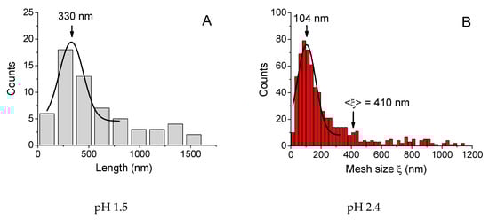 In order to get deeper insight into the reasons for the change of mechanical properties of xanthan/CrCl3 solutions at different pH, the rheological data were correlated with the microstructural investigations by freeze-fracture transmission electron microscopy (FF-TEM). The corresponding micrographs of the solutions are presented in Figure 5. At low pH 1.5, corresponding to the low elasticity and liquid-like behavior of the samples, some individual or partially connected elongated objects are seen in Figure 5A (marked by red circles). The mean length of individual objects was equal to 330 nm (Figure 6A), but some much larger objects (up to ca. 1–2 μm) were also present. One can suggest that all these objects correspond to single or partially overlapping xanthan macromolecules. Indeed, in the double-helix state, they have a mean contour length of several hundreds of nanometers and a persistence length of 120 nm [18], forming rigid “rod-like” objects. At pH 1.5 cross-linking of xanthan by chromium does not occur due to the fact that carboxylic groups are protonated, and, therefore, the microstructure of the sample is similar to that of xanthan solution in the absence of CrCl3. Indeed, no well-developed network was seen at the micrograph, which was in accordance with the fact that at 0.1 wt % the solution is in a semidilute unentangled regime.