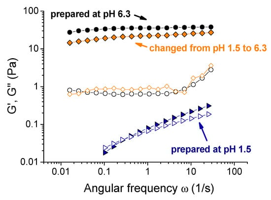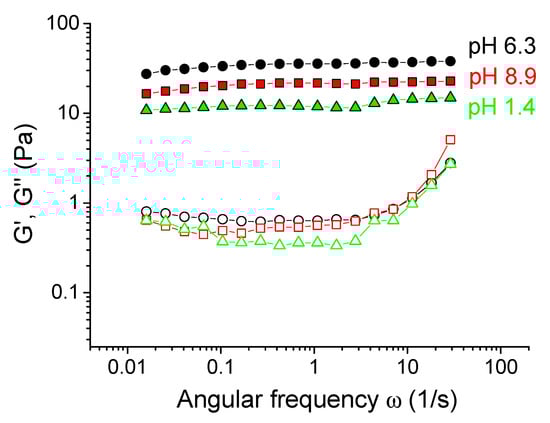 In order to study the reversibility of xanthan cross-linking by chromium at different pH, the gels initially prepared and cross-linked at pH 6.3 (corresponding to the maximum elasticity) were taken, and their pH was changed by the addition of a small amount of acid (5 M HCl) or base (5 M KOH). It did not significantly alter the polymer concentration in the gels, but changed their pH to strongly acidic (1.4) or basic (8.9; the green and red arrows in Figure 3A represent these two routes). If the samples were initially prepared at such low or high pH values, they did not cross-link and behave as viscous liquids. However, the samples with pH “post-changed” from 6.3 remained gel-like. A weak syneresis was observed for a gel with final pH 1.4, which is explained by the fact that carboxylic groups not involved in the interaction with chromium ions become uncharged, thus reducing the counter ions pressure and the swelling degree of the gel. The mechanical properties of the gels “post-prepared” at pH 1.4 and 8.9 only slightly differed from the initial gel (Figure 7). An elastic plateau remained at the G’(ω) curve, showing that the network was not disrupted. It means that if the cross-links have been formed, they do not break upon further change of pH, and it confirms the chemical nature of the cross-links, which are coordination covalent bonds instead of ionic ones. This result opens a versatile route for preparing ion-cross-linked xanthan gels with controlled mechanical properties in a wide pH range, where they initially cannot be prepared.