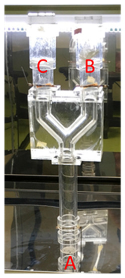 A total of 20 ± 3 female F. taiwana were allocated on the insect end (Figure 1A). An EGO nanofibrous membrane was positioned on the odor end (Figure 1B) of the Y-tube olfactometer and simultaneously a PVA fibrous membrane was placed on the control end (Figure 1C). After 3 min, the EGO membrane was removed for 12 min, and repositioned on the odor end again. This procedure was to prevent F. taiwana from being numb with olfaction after they stay in a ligand-odor space. A test cycle lasted 15 min, and the number of F. taiwana was recorded for 8 cycles. Namely, the length of a full test was 2 h. A new batch of F. taiwana was used for each test and 3 samples for each specification were used. The repellency rate against F. taiwana was computed to have the value in percent using the following equation.