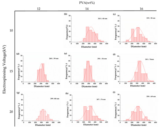 Diameter distribtuion of nanofibrous membranes with different combinations of concentration of PVA solution (column: 12, 14, and 16 wt%) and spinning voltage (row: 10, 15, and 20 kV).