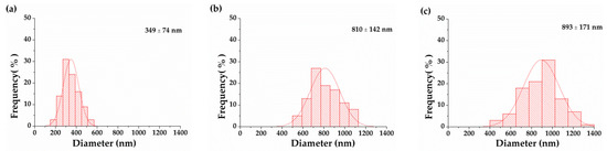 Diameter distribution of PVA/EGO nanofibrous membranes made of a specified spinning voltage of 15 kV. The PVA/EGO ratios are (a) 95/5, (b) 90/10, and (c) 85/15.